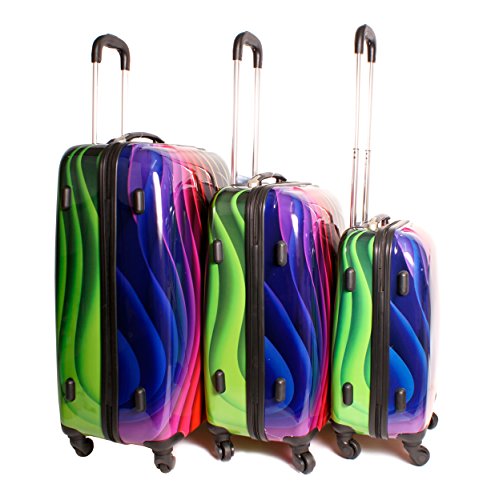 Best Seller! 2408 Wavy Multicolour Rainbow Set of 3 Suitcases - Super Lightweight 4 wheels - Funky Luggage Set - Hard Plastic Review